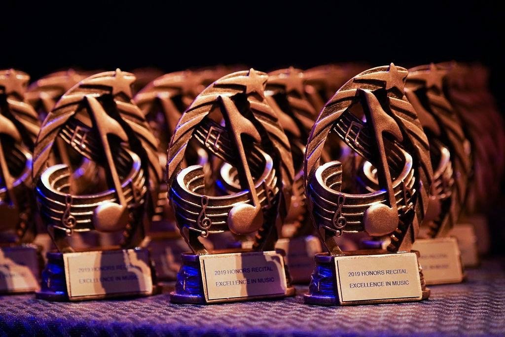 • Multiple awards trophies with musical notes and a star design on top, displayed on a table.