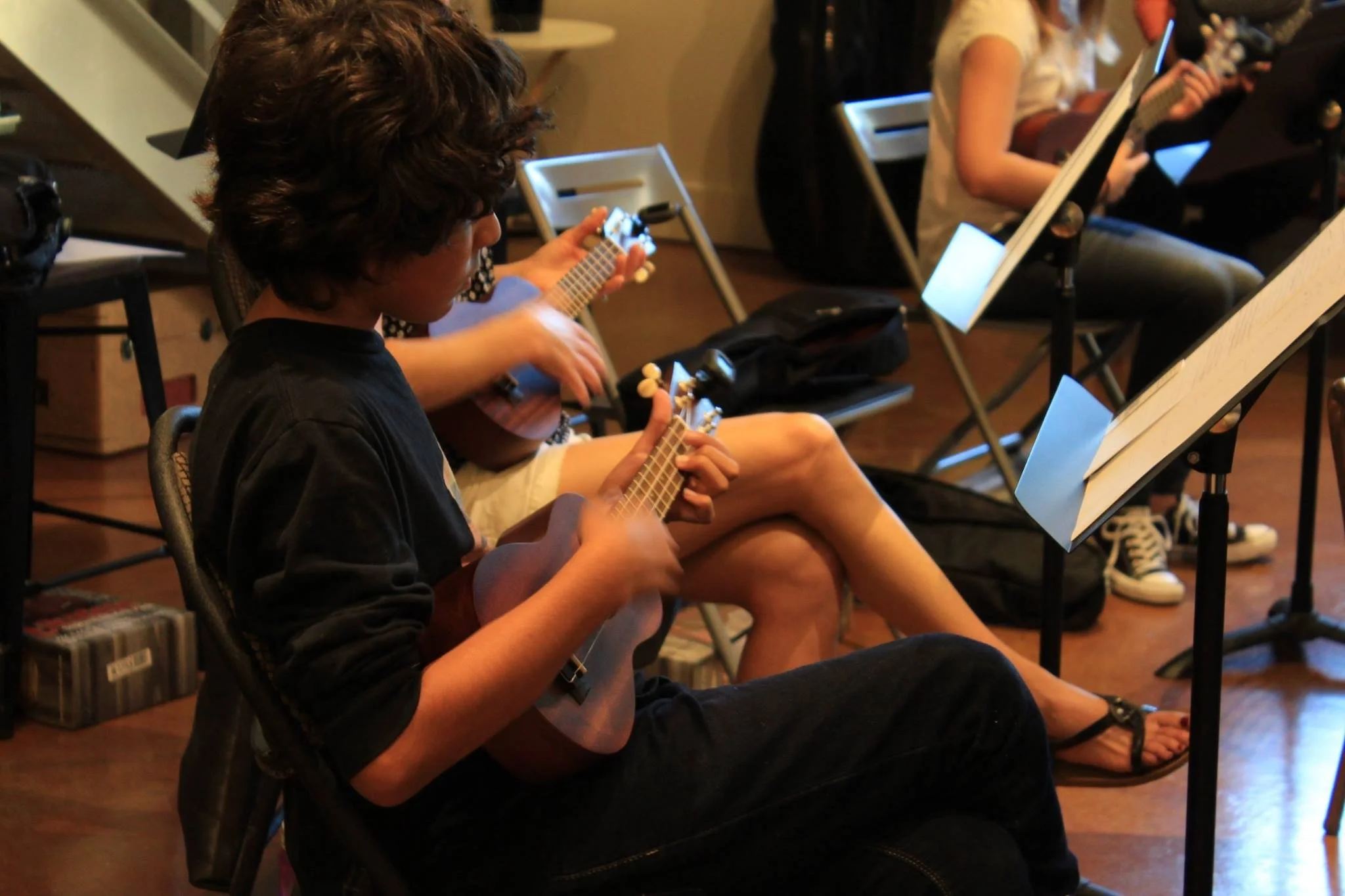 • Young people sitting on chairs, playing ukuleles in a music practice session, with sheet music on stands in front of them.