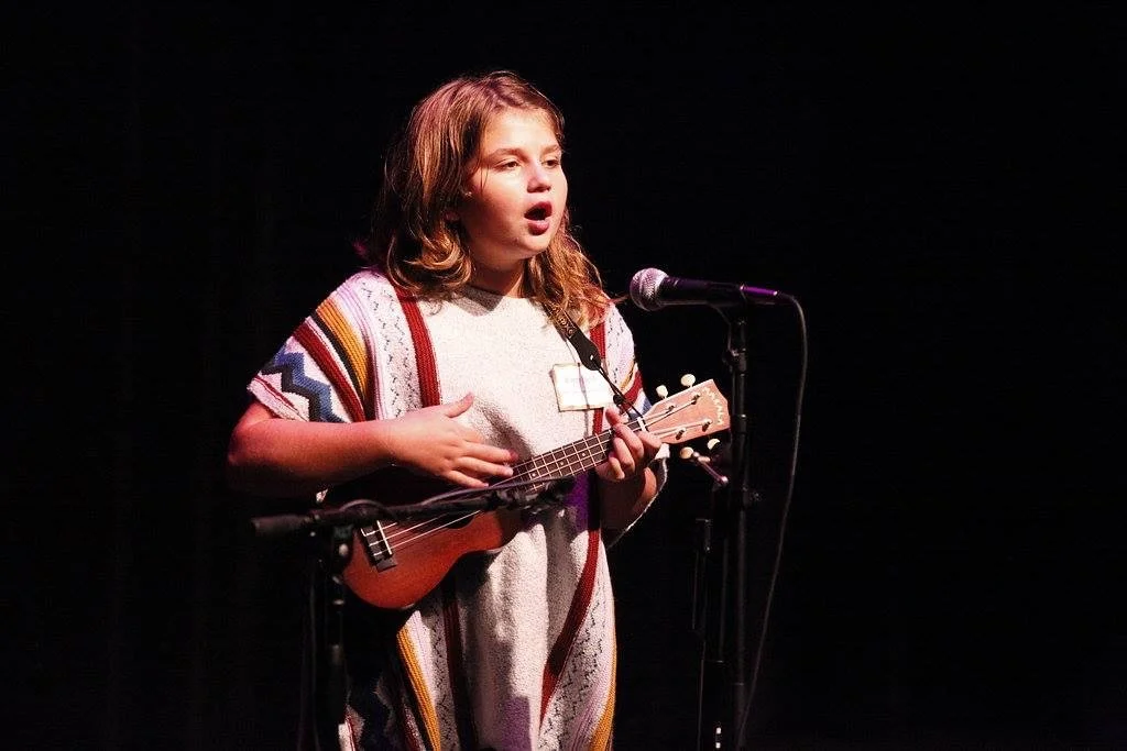 • Young girl singing and playing a ukulele on stage with a microphone