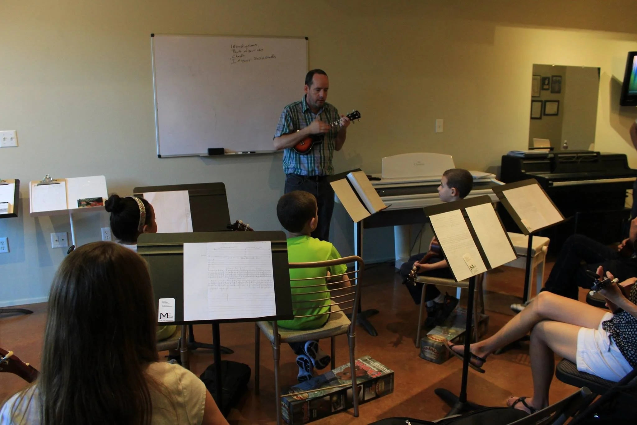 • Man playing ukulele in a music classroom with children seated around, music stands, whiteboard, and piano.